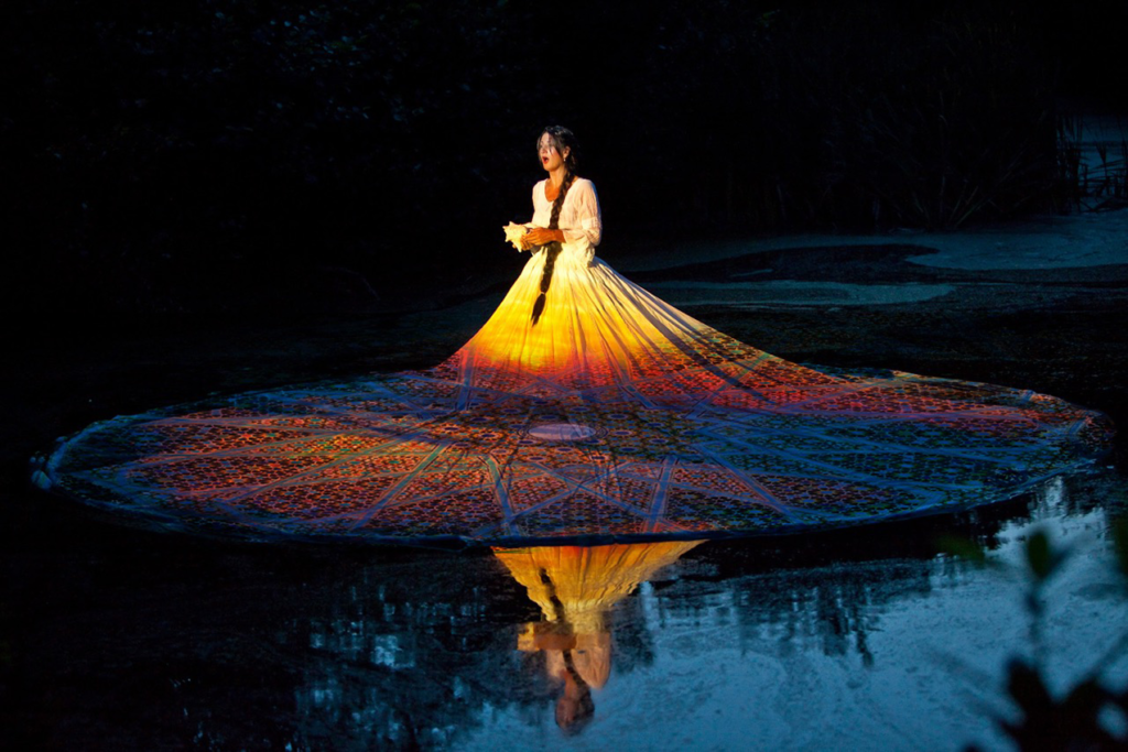 In de performance Sheherazade, ontwikkeld voor de Marrakech Biennale, staat het stuk Sheherazade van Maurice Ravel centraal. Dit stuk, dat een toonbeeld is van begin 20steeeuws Orientalisme: het geïdealiseerde idee van de Orient, de manier waarop het Westen ooit de Arabische en Aziatische wereld zag. De zangeres drijft als een eiland op het water, alleen in haar eigen idee van de sprookjesachtige wereld,verbeeld door 3d mapping beelden die op haar jurk worden geprojecteerd, terwijl een ‘echte’ Arabische zangeres haar toezingt vanaf de kade. De twee werelden smelten samen wanneer de twee vrouwen samen een Arabisch lied zingen. Voor deze performance werkte Lotte samen met een jonge Marokkaanse zangeres. Twee werelden smolten samen tijdens de performance.